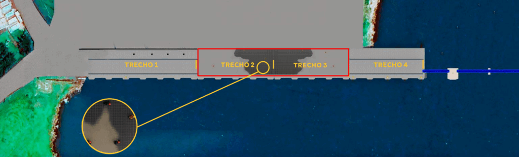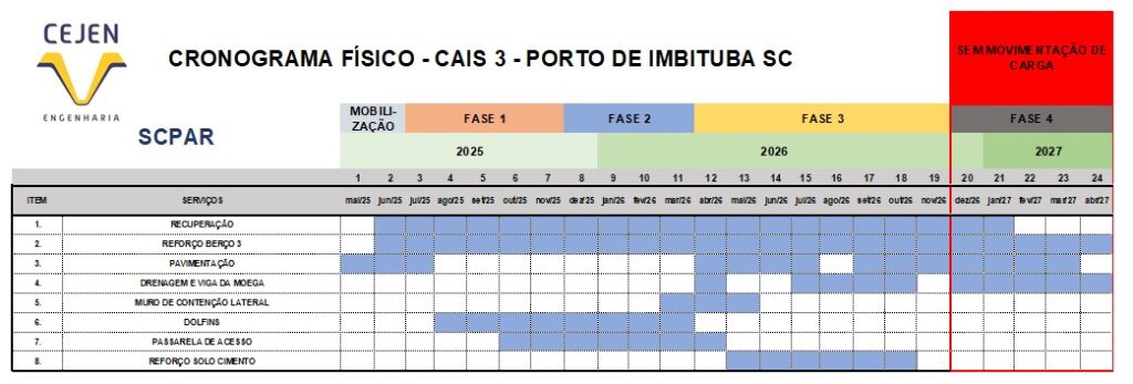 A última fase também contará com atividades de pavimentação da retroárea e serviços no trecho central do berço (2 e 3), como o reforço do solo, laje, drenagem e viga do trilho da moega e a instalação de defensas. Com as atividades da obra neste ponto central, não será possível a atracação de navios de forma simultânea à obra, como ocorrerá nas demais fases. Por isso, na Fase 4, será necessária a interrupção das atividades portuárias no Cais 3, em até 5 meses. Ao fim desta etapa, a obra estará completa, possibilitando a ampliação das operações portuárias no local. Cabe apontar que o período de paralisação das operações no Cais 3 está sendo analisado pela Autoridade Portuária e já se estuda a viabilidade de diminuição desse período para até três meses.
